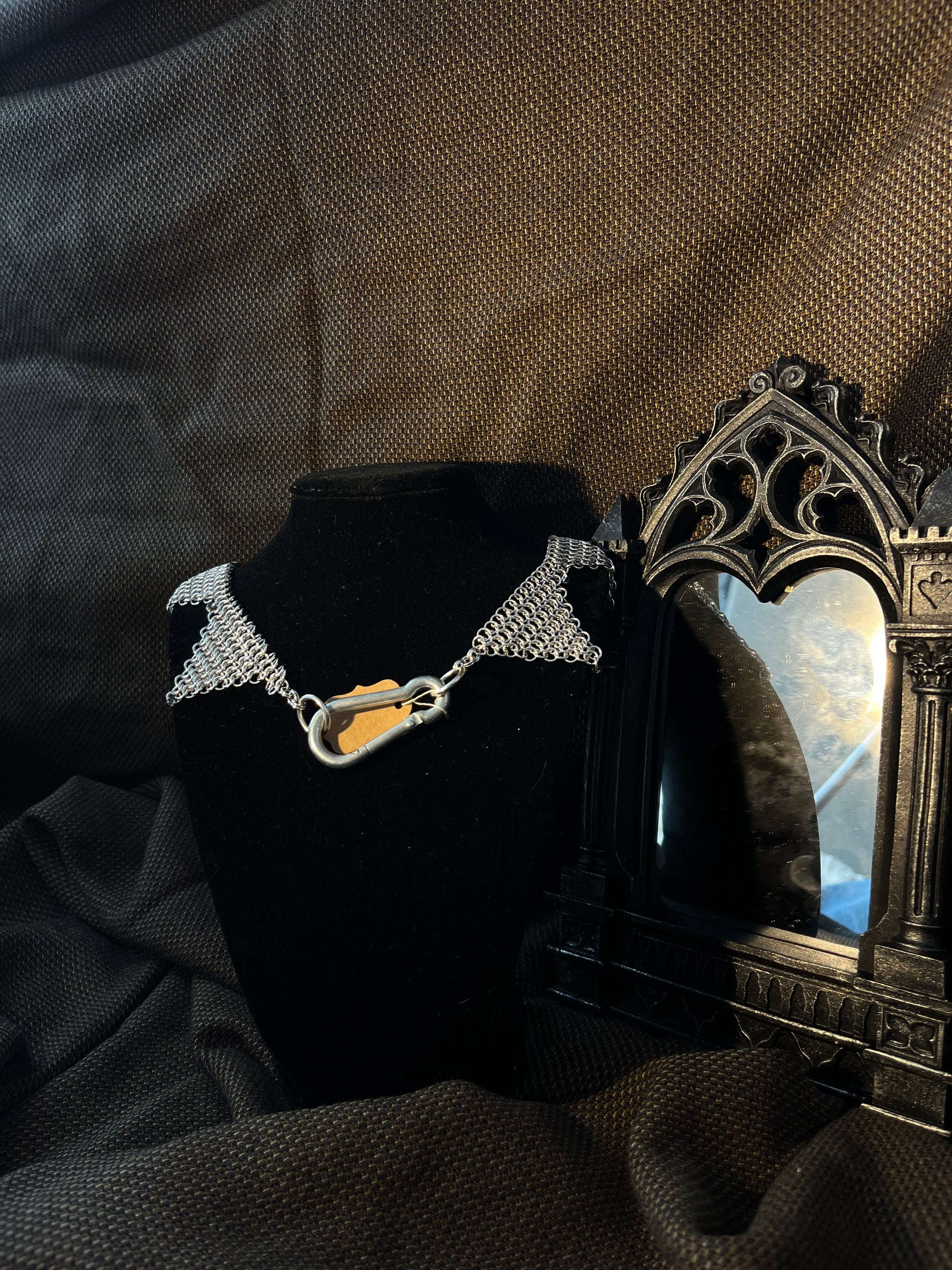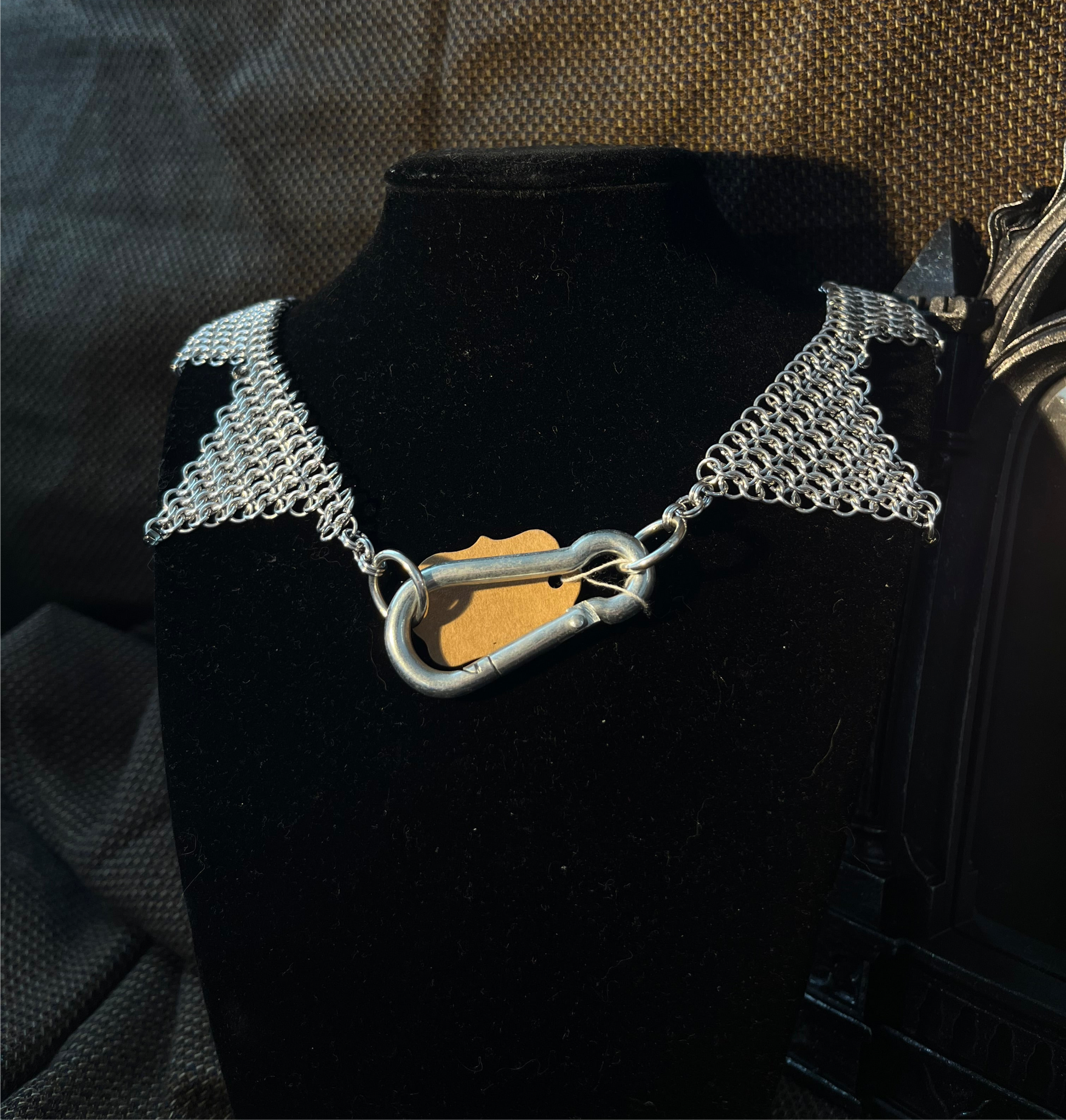 A clown collar closed in the front with a hefty carabiner! This particular piece features black and white glass beads at the points and sits slightly lower than your average choker on most people’s necks.