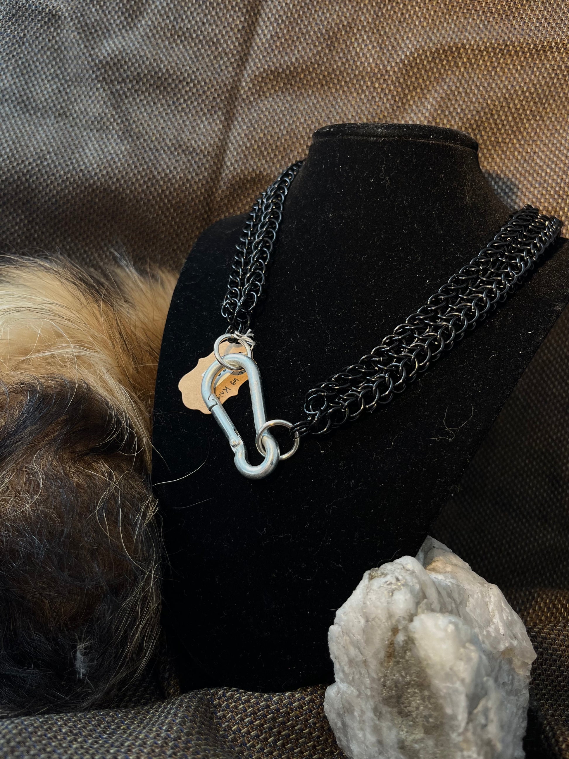 A hefty dragon-back weave choker that clasps up front with a carabiner. These guys have some good weight to them!